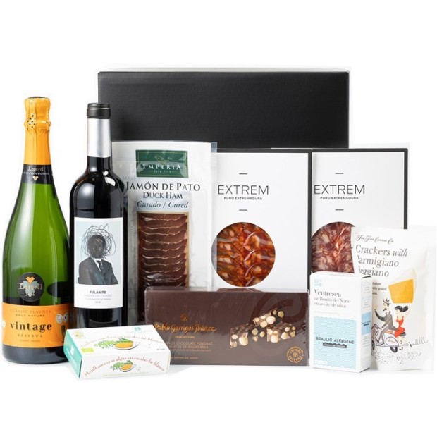 <p>Detalle de su contenido:</p><p> </p><p> </p><ul><li><p>Chorizo Cular Ibérico de Bellota Loncheado "Extrem Puro Extremadura" 80 gr.</p></li></ul><div> </div><ul><li><p>Salchichon Cular Ibérico de Bellota Loncheado "Extrem Puro Extremadura" 80 gr.</p></li></ul><div> </div><ul><li><p>Jamón de Pato "Imperia" 50 gr.</p></li></ul><div> </div><ul><li><p>Ventresca de Bonito en Aceite de Oliva "Braulio Alfageme" 115 gr.</p></li></ul><div> </div><ul><li><p>Mejillones con Algas en Escabeche Blanco "Porto Muiños" 130 gr.</p></li></ul><div> </div><ul><li><p>Crackers con Parmigiano - Reggiano "The Fine Cheese Company" 45 gr.</p></li></ul><div> </div><ul><li><p>Turrón de Chocolate Fondant con Nueces de Macadamia "Pablo Garrigós Ibañez" 300 gr.</p></li></ul><div> </div><ul><li><p>V. Tinto Fulanito D.O. Ribera del Duero 75 cl.</p></li></ul><div> </div><ul><li><p>Cava Ecológico Vintage de Loxarel Brut Nature Reserva 75 cl.</p></li></ul><div> </div><ul><li><p>Elegante y moderna caja de regalo</p></li></ul>