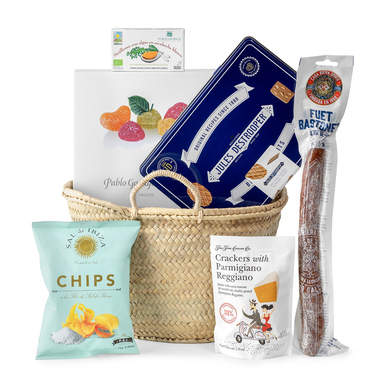 Con la tentadora propuesta de sucumbir al puro placer del picoteo informal hemos preparado esta cesta gourmet para regalo.